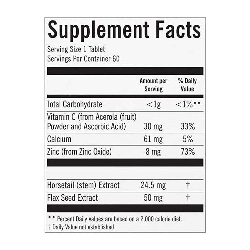 Vitamina C (dall'acerola (frutto) in polvere e acido ascorbico), cellulosa microcristallina, maltodextrina, estratto di coda di cavallo (stamina), ferro (dal fumarato ferroso), idrossipropilcellulosa,Zinc (dal zincossido), Biotina e così via.