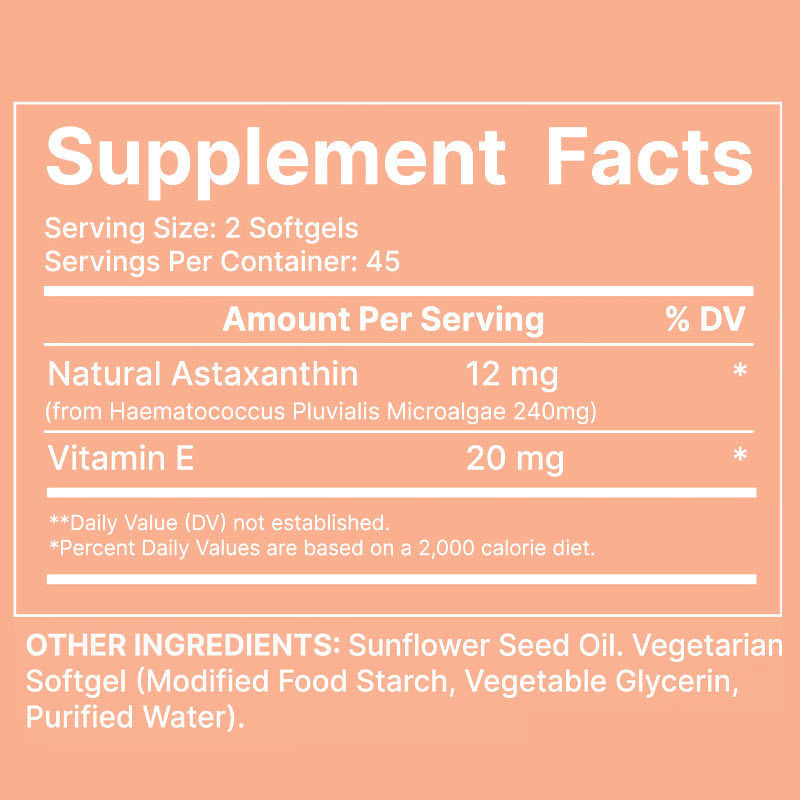 Sfrutta la potenza dell'astaxantina – 6.000 volte più forte della vitamina C – combinata con la vitamina E per una protezione cellulare senza pari. Combatti la fatica, aumenta la luminosità della pelle e proteggi i tuoi occhi in una sola capsula giornaliera.