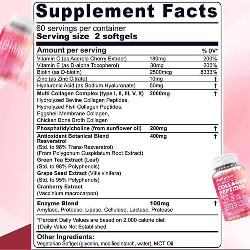 Le nostre capsule molli di collagene sono arricchite con 4 miscele vegetali biologiche e vitamine C, E, biotina e zinco per migliorare ulteriormente gli antiossidanti, nonché ingredienti di supporto digestivo e di disgregazione per favorire un assorbimento efficace.